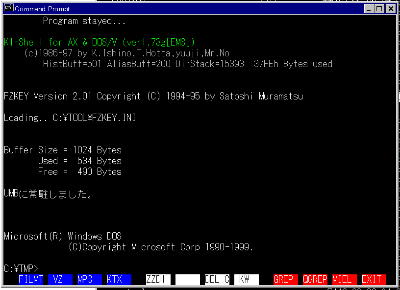 FZKEY、KSH、KILL106(DOS用),ATOK8も動くようだ。KSHの履歴の共有が出来ないとかKILL106とHIDECAPSがバッティングするとか、細かい所はあるけれど、だいたいWIN98と同程度のDOS窓になった。