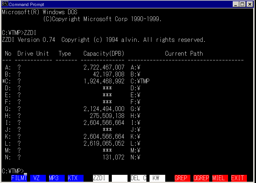 ZZDI.EXE。WIN95、95では未知のアーキテクチャですとエラーを出すが、NTではなぜか動く。しかし容量表示は適当であるようだ。