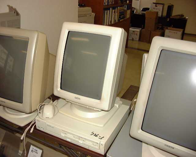 下の写真の真ん中、OASYS 100DPのセット モニタ、親指シフトキーボード、マウス、本体 と 100DP-Sの本体。