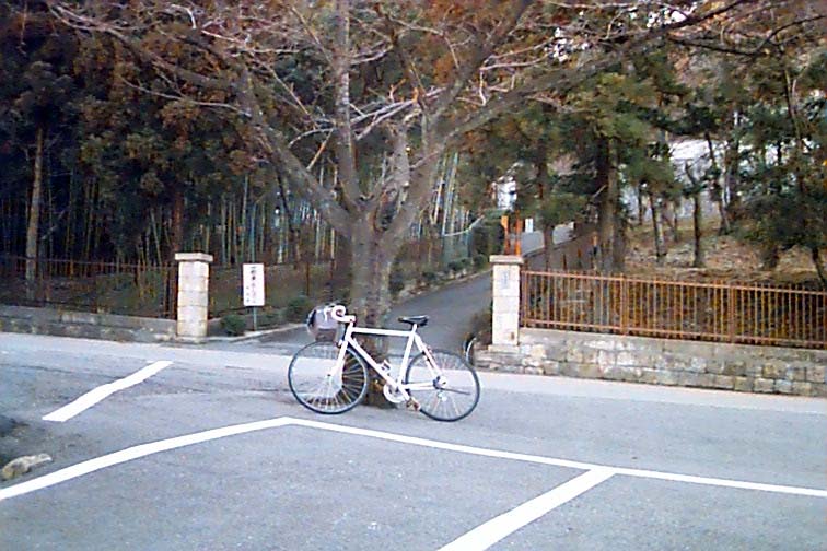 甲山神社の入り口の駐車場。力が全然ないのですぐ休むのだ。あの白いのが私の自転車って、書かないでもわかるか。
