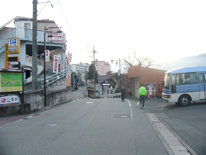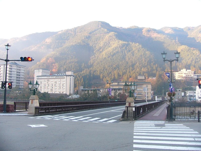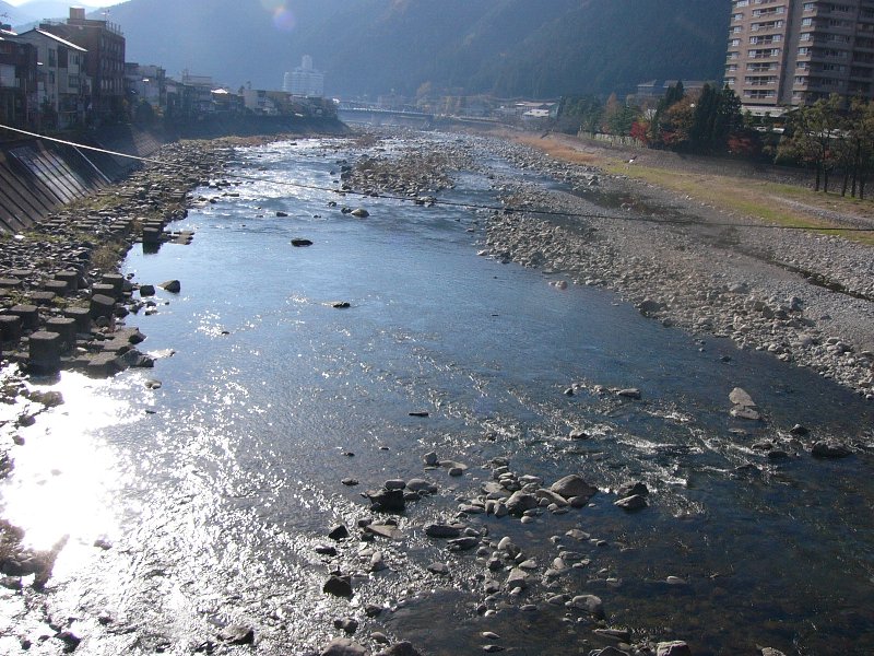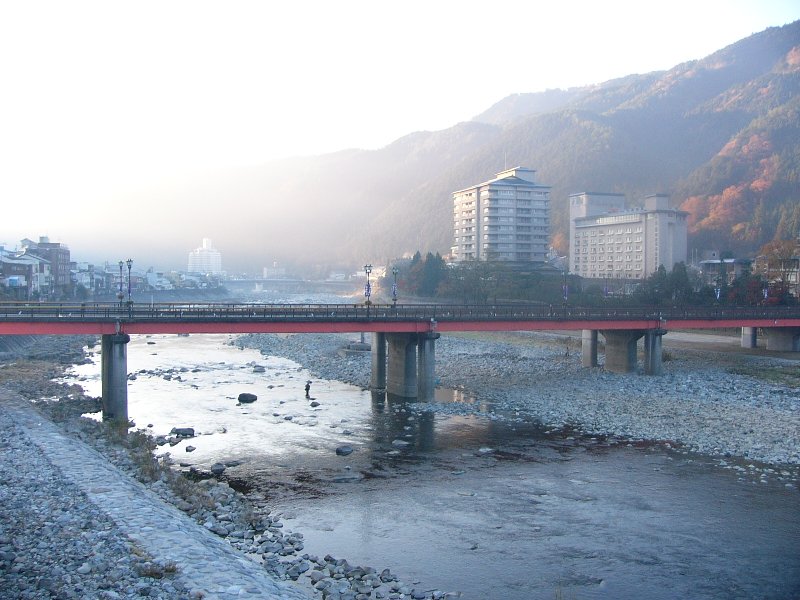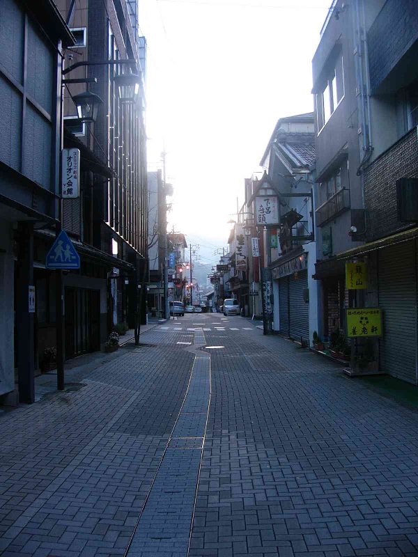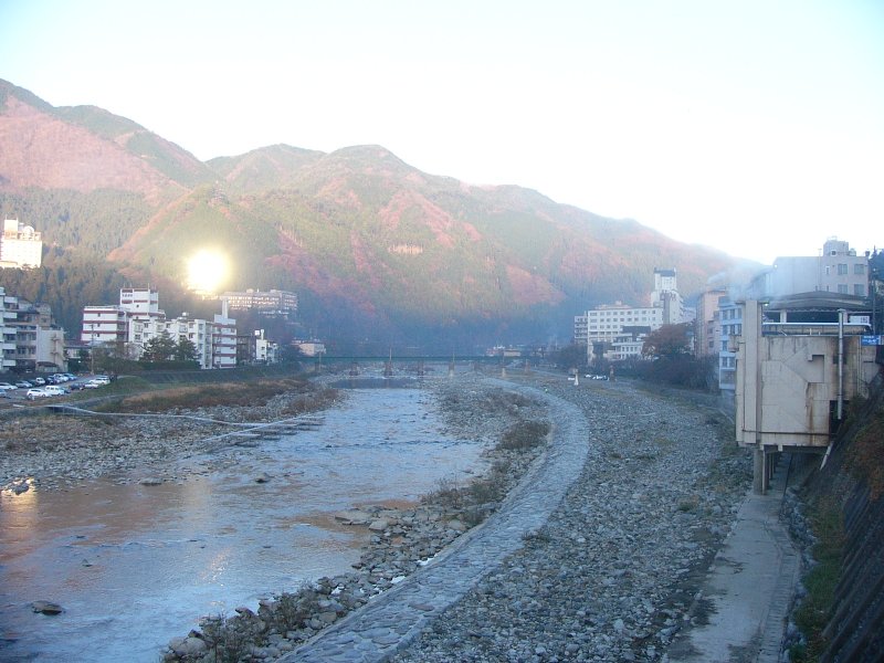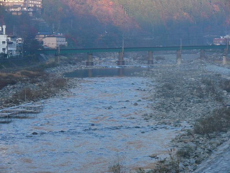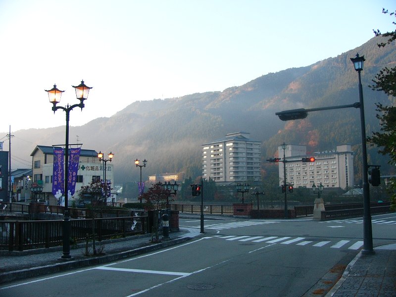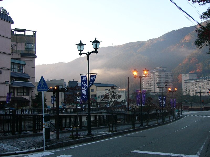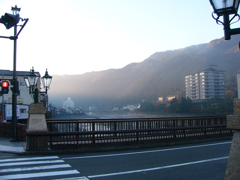 温泉街を流れる川です。朝早いので街灯がついてますね。