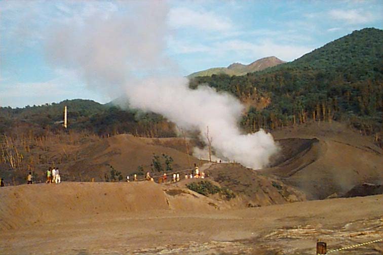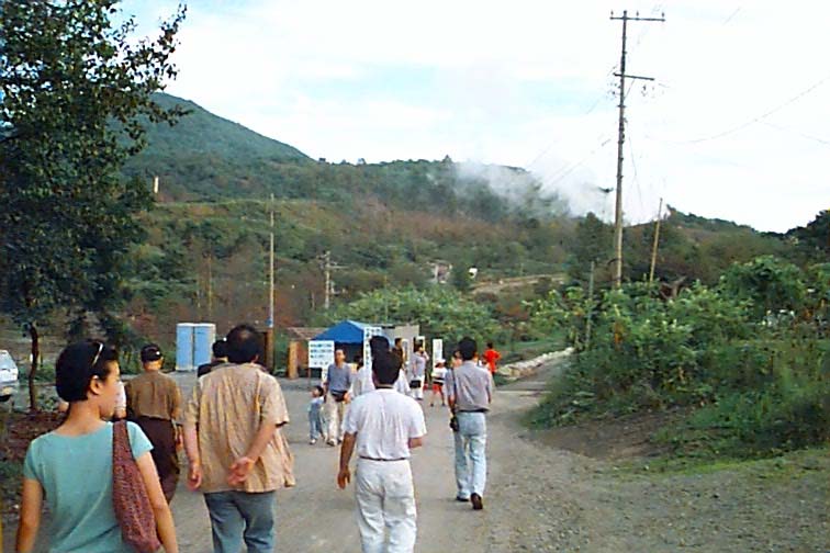 有珠山火口観光へと向かう人影、すでに噴煙が見えてますね。