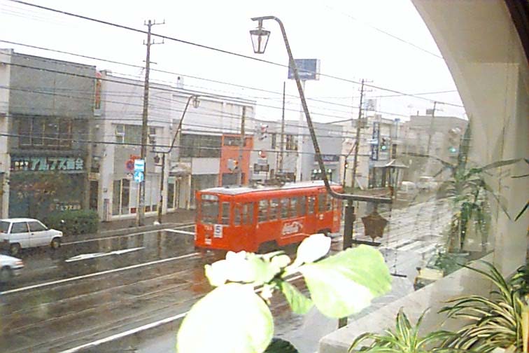 三泊目のホテルのロビーの窓から撮りました、函館市電です。