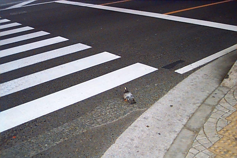 高架下の交差点で、信号待ちをしていると鳩がやってきて、道におちている何かをついばんで食べていた。