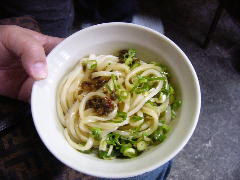 うどん 谷川米穀店 小です 醤油、ネギ、自家製とうがらし、お酢がかかってます。
